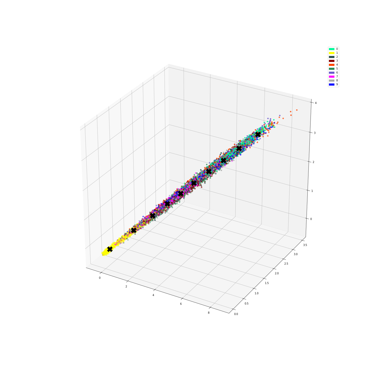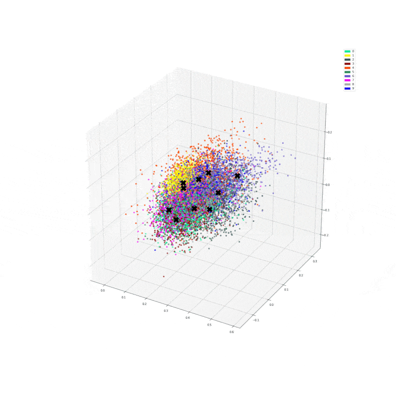 In this post, we'll try to pass the data through a neural network which outputs in three dimensions. We then use K-means directly as a loss function, trying to get it to cluster points close to their assigned centroids and far from the others. This method is supposed to fail. However, I hope to use this as an entry point to some more interesting methods. Essentially, I also just thought I'd show it off since I haven't seen it presented before.